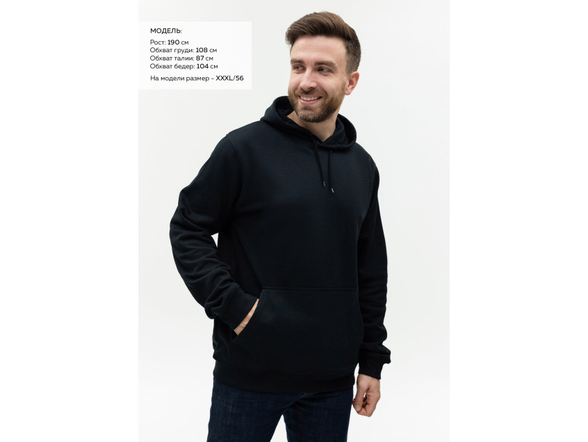 Размер мужского худи: XXL/54. Параметры модели: рост 190 см.; обхват груди 108 см.; обхват талии 87 см.; обхват бедер 104 см.