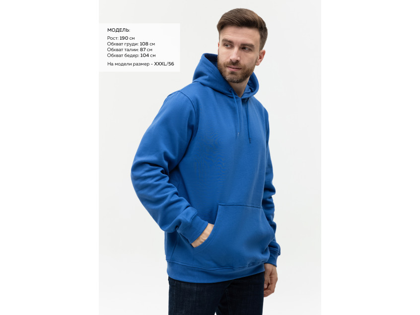 Размер мужского худи: XXL/54. Параметры модели: рост 190 см.; обхват груди 108 см.; обхват талии 87 см.; обхват бедер 104 см.