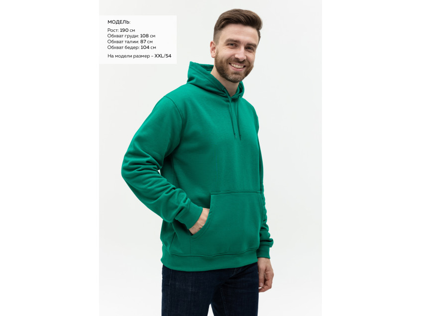 Размер мужского худи: XXL/54. Параметры модели: рост 190 см.; обхват груди 108 см.; обхват талии 87 см.; обхват бедер 104 см.