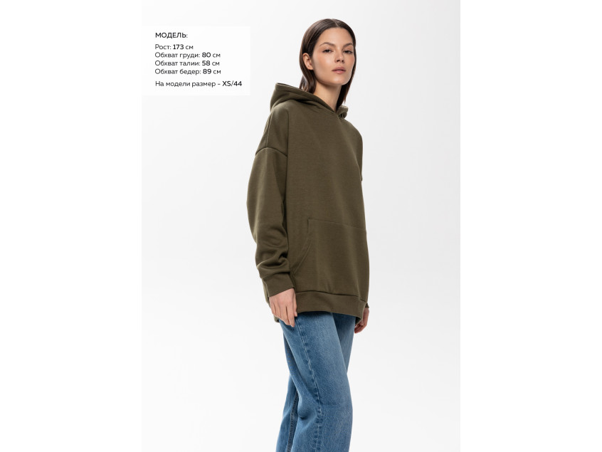 Размер женского худи: XS/44. Параметры модели: рост 173 см.; обхват груди 80 см.; обхват талии 58 см.; обхват бедер 89 см.