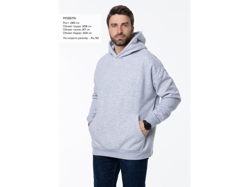 Размер мужского худи: XL/52. Параметры модели: рост 190 см.; обхват груди 108 см.; обхват талии 87 см.; обхват бедер 104 см.