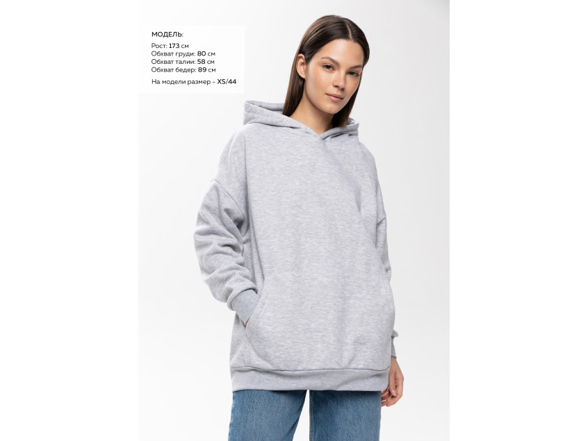 Размер женского худи: XS/44. Параметры модели: рост 173 см.; обхват груди 80 см.; обхват талии 58 см.; обхват бедер 89 см.