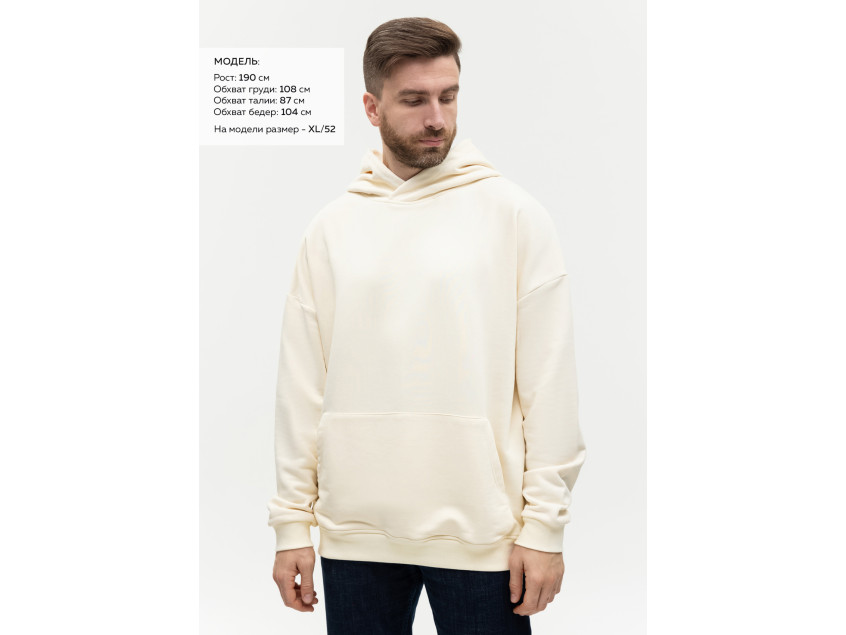 Размер мужского худи: XL/52. Параметры модели: рост 190 см.; обхват груди 108 см.; обхват талии 87 см.; обхват бедер 104 см.