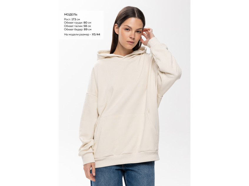 Размер женского худи: XS/44. Параметры модели: рост 173 см.; обхват груди 80 см.; обхват талии 58 см.; обхват бедер 89 см.