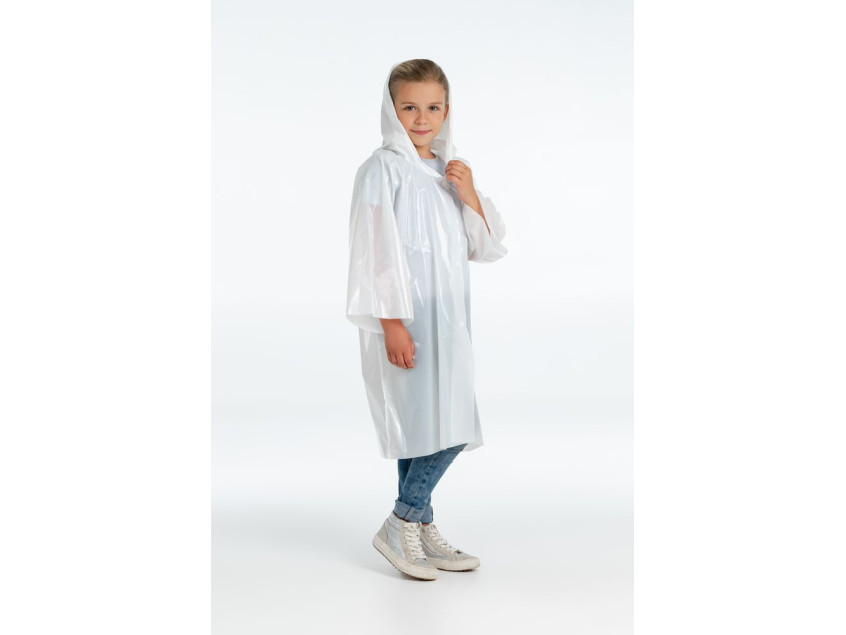 Дождевик-плащ с капюшоном и длинным рукавом из полиэтилена высокого давления (ПВД). Застегивается на липучку.