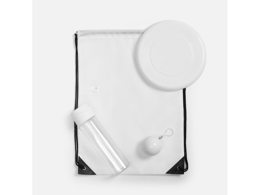 | Материал: | бутылка, футляр, тарелка-фрисби - пластик; плащ - полиэтилен, ПНД, плотность 12 мкм; рюкзак-мешок - спанбонд, плотность 70 г/м² |