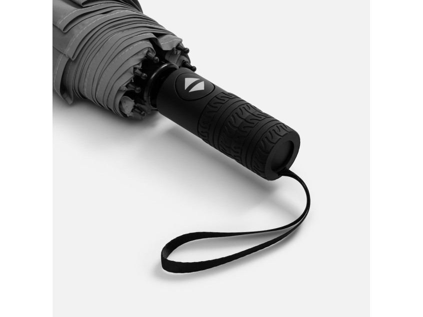 Стильный прочный зонт Tyre не боится ржавчины и нагрузок благодаря каркасу из стекловолокна. Светоотражающий кант делает этот зонт незаменимым спутником в темное время суток, а тактильный рисунок протектора шины на ручке превращает его в продуманный подарок для автолюбителей и партнеров автомобильной сферы.