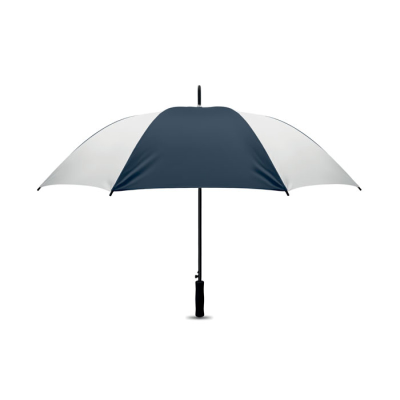 27 inch auto open umbrella in 190T pongee with black plated metal shaft and ribs. Black plastic tips. Straight black EVA handle. Manual closure.