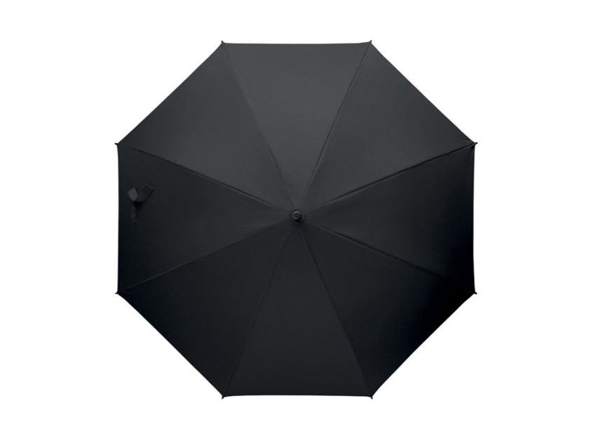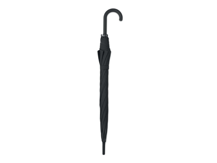 23 inch straight auto open umbrella with black plating metal frame, fibreglass ribs and panels in 190T pongee fabric. Plastic tips and top. Rubberized PP plastic curved handle. Manual closure.