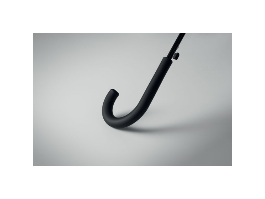 23 inch straight auto open umbrella with black plating metal frame, fibreglass ribs and panels in 190T pongee fabric. Plastic tips and top. Rubberized PP plastic curved handle. Manual closure.